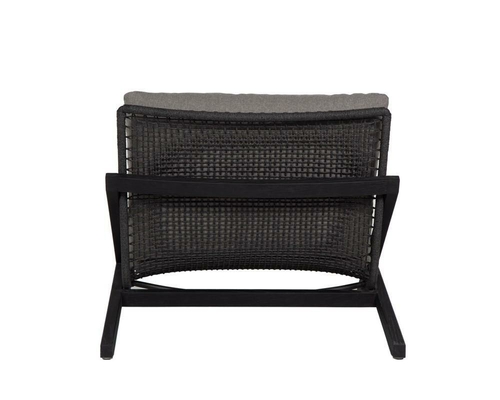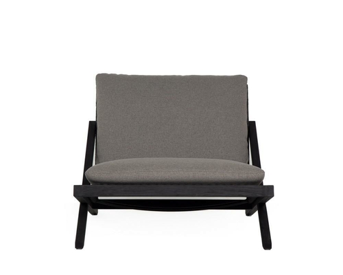The chair features a relaxed low-profile silhouette supported by a strong powder-coated aluminum frame in a dark grey finish, providing exceptional structural stability while maintaining a sleek architectural look. The frame is treated with Axalta Alesta powder coating, making it highly resistant to corrosion, moisture, and outdoor weather conditions.