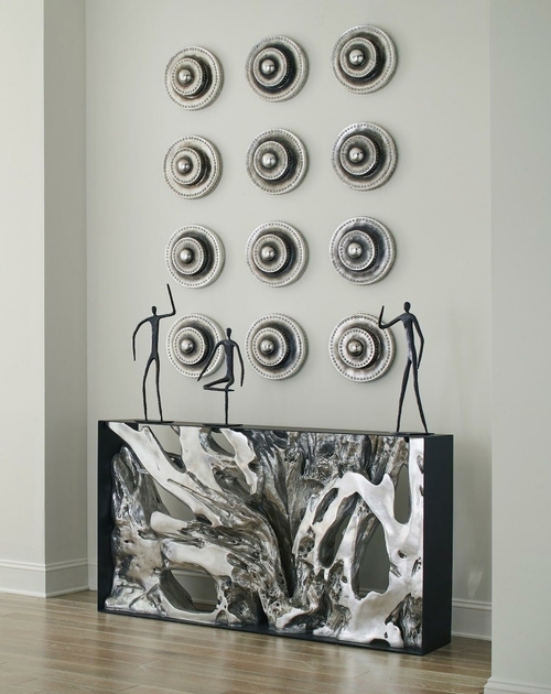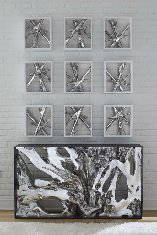 Because both sides of the piece are fully finished, the console can be positioned not only against a wall but also behind a sofa or as a freestanding divider element within a room. The result is a versatile statement piece that introduces texture, artistry, and visual depth to the interior.