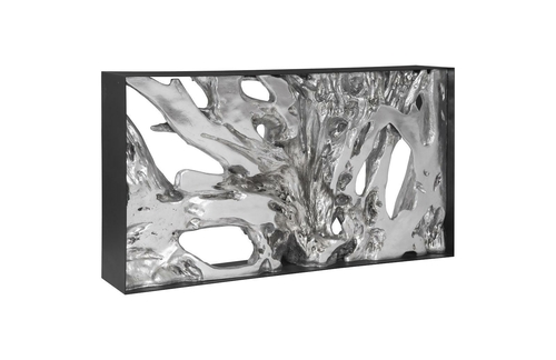 Crafted from a carefully molded resin composite, the intricate root-like structure replicates the organic complexity of weathered wood that might take nature centuries to form. The entire surface is finished in luminous silver leaf, giving the piece a sophisticated metallic glow while highlighting every natural contour and cavity of the sculptural form.