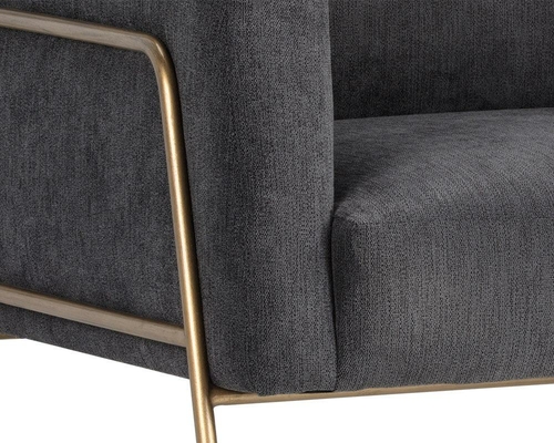This elegant armchair features a clean contemporary silhouette supported by a slender exposed metal frame in antique brass, creating a sophisticated contrast between warm metallic tones and soft upholstery. The open frame design gives the chair a light architectural presence while maintaining strong structural support.