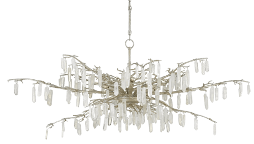 The textured silver finish complements the natural quartz beautifully, enhancing the organic character of the design while maintaining a sophisticated aesthetic suitable for elegant interiors. This balance between natural inspiration and refined craftsmanship makes the chandelier a true statement piece.