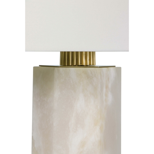 Natural brass hardware introduces a warm metallic accent that complements the soft translucence of the alabaster. Topped with a crisp linen shade, the composition diffuses light into a calm, ambient glow while maintaining a structured and contemporary silhouette.