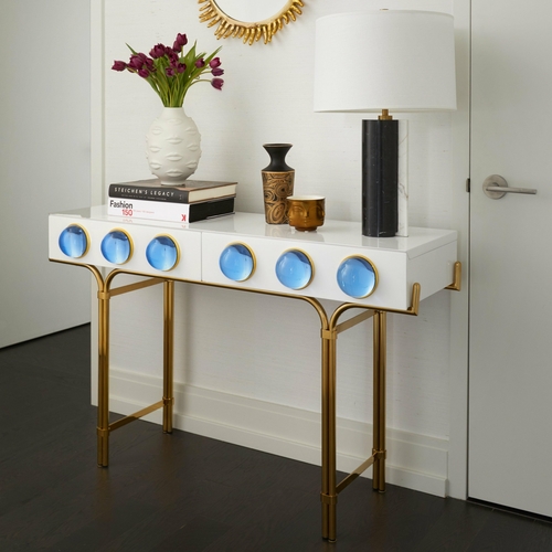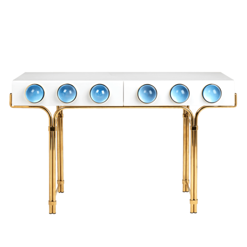 Across the front of the drawers, striking blue acrylic cabochons act as oversized jewel-like pulls. These glossy circular accents introduce colour and personality, transforming the console into a true statement piece while maintaining a playful balance between modern design and decorative glamour.