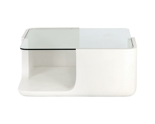 Resting above the base is a clear glass tabletop that appears to float effortlessly within the structure. This transparent surface highlights the sculptural foundation beneath while maintaining an airy and modern aesthetic.