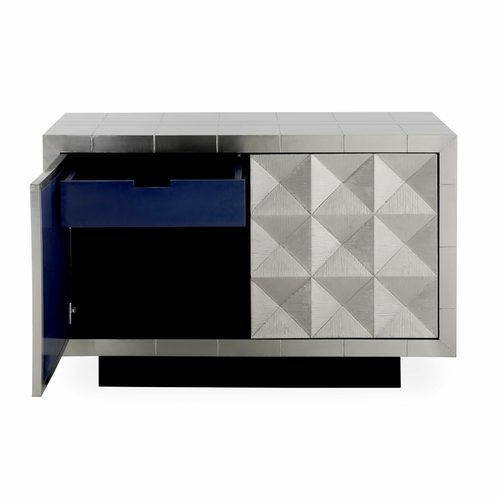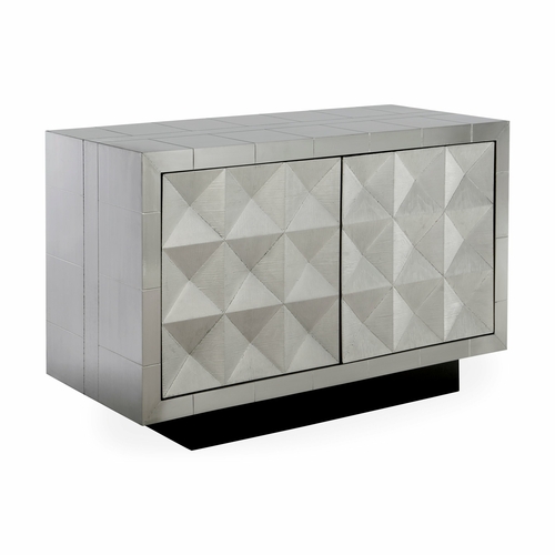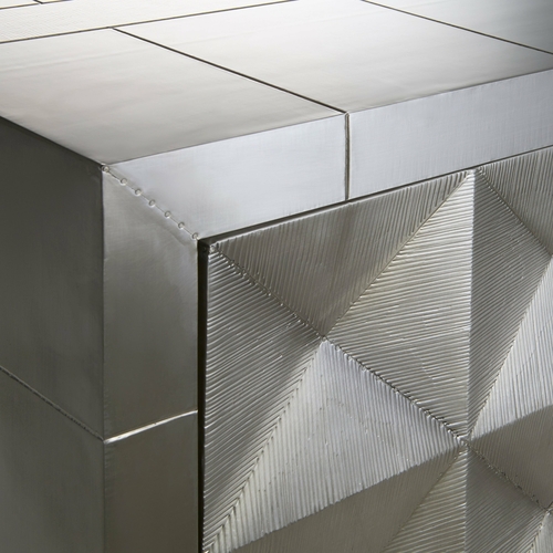 This statement cabinet is crafted from nickel-plated metal, featuring meticulously hand-stamped geometric patterns that create a dynamic, faceted surface across the doors. The repeating triangular motif catches and reflects light from different angles, giving the cabinet a luminous appearance reminiscent of silver leaf, while maintaining the durability of metal construction.