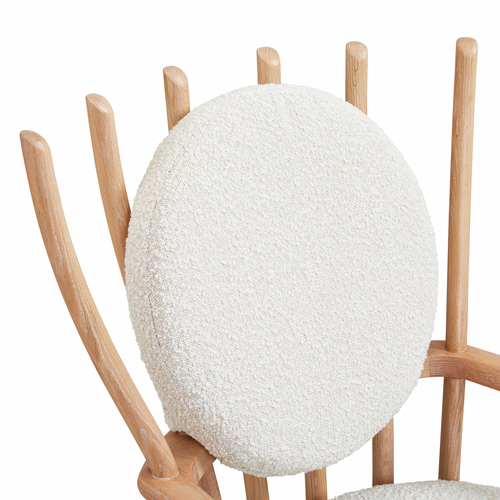 Comfort is at the center of the design. The seat features extra-thick cushioning upholstered in oatmeal bouclé fabric, delivering both softness and durability. The bouclé’s textured weave adds visual warmth and tactile appeal, complementing the natural wood frame.